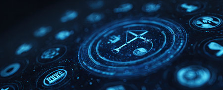 This image features a detailed view of a digital interface, showcasing various icons and circular data displays. The scene is dominated by a cool blue color palette with highlights, creating a futuristic and technological atmosphere. This could be used for articles, reports, or visuals related to technology and data.