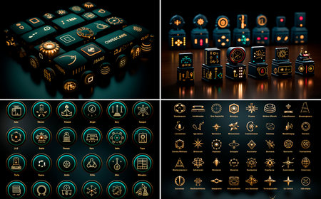 Floating cluster of glowing circular UI icons hovering over deep navy gradient, with light streak. Interface, holographic, dashboard, analytics, education, exploration, minimal