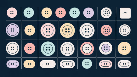 A neatly arranged grid showcasing a variety of cute, pastel-colored buttons in different shapes and designs. The overall aesthetic is clean, modern, and visually appealing. AI generated.
