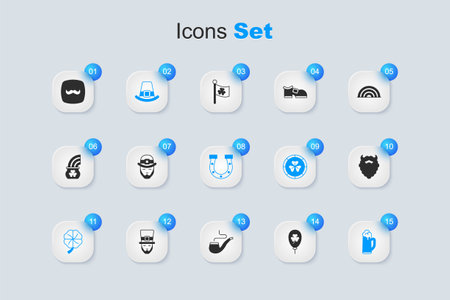 Set Clover trefoil leaf with tag Leprechaun Money bag clover Beer bottle Rainbow Bow tie and Mustache and beard icon. Vector.