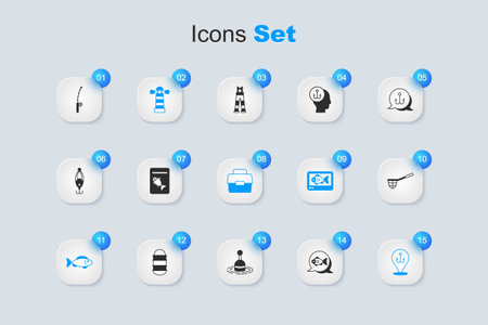 Set Fish Served fish on plate Lighthouse Fishing hook net rod and Case or box for fishing icon. Vector.