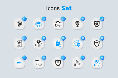 Set Contract in hand Life insurance House Flood car Shield Graduation cap with shield Delivery security and flood icon. Vector.