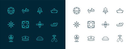 Set line Folded paper boat Captain hat Kayak and paddle Sailor Lifebuoy Ship bell porthole and icon. Vector.
