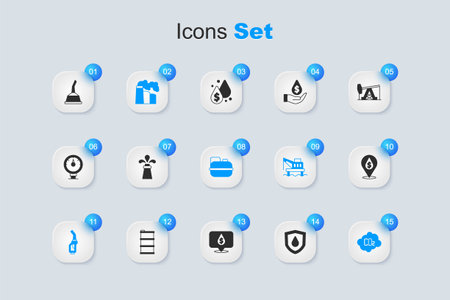 Set Oil drop on shield rig and gas industrial factory Gasoline pump nozzle CO2 emissions cloud with dollar symbol Canister for motor machine oil and gasoline icon. Vector.