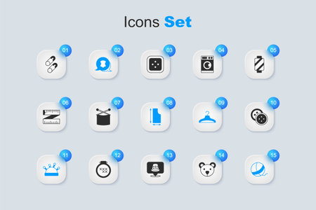 Set Teddy bear plush toy Knitting needles Leather Needle bed and Yarn ball Sewing button for clothes Closed steel safety pin and pattern icon. Vector.