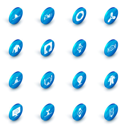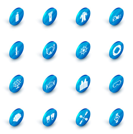 Set Flashlight Lifebuoy Boat propeller turbine Wetsuit Floating on the sea jacket Photo camera and Diving watch icon. Vector.
