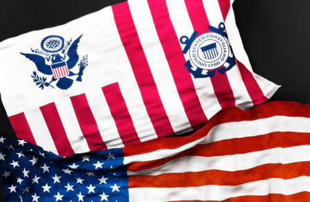 Flag of Ensign of the United States Coast Guard along with a flag of the United States of America as a symbol of unity between them, 3d illustration