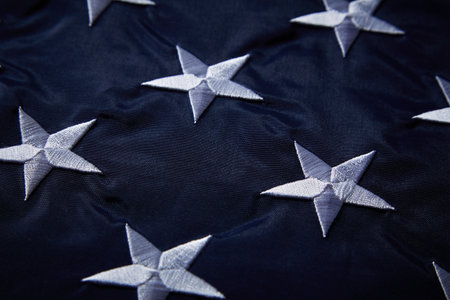 White American stars on usa flag. Selective focus in foreground. Abstract pattern or background with usa flag. Macro or close up shot. Patriotic concept.