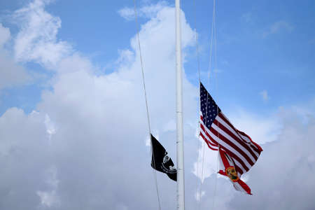 Close up isolated image of a POW, MIA (Prisoner of War, Missed in Action) Flag flying in the wind on a sunny day. Emblem depicts silhouette of a prisoner with barbed wire and guard tower in background