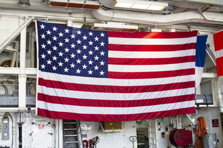 STATEN ISLAND, NEW YORK - MAY 29:Huge American flag inside the deck of US Navy destroyer during Fleet Week 2012 on May 29, 2012 in Staten Island, New York