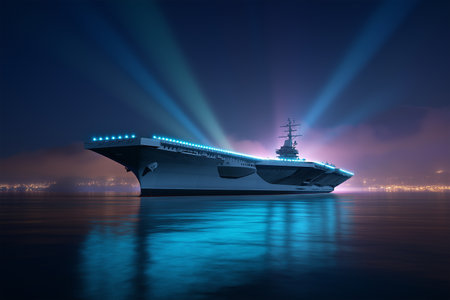 Nighttime view of a futuristic aircraft carrier in calm waters