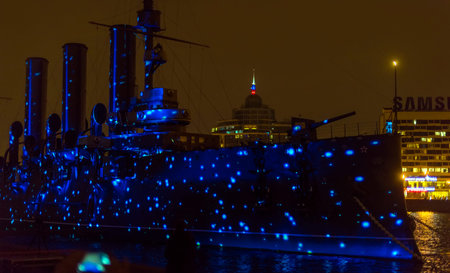 St. Petersburg, RUSSIA 05,11,2017 Multimedia show in honor of the 100th anniversary of the revolution on the Aurora Cruiser