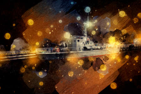 War concept. Night battle scene at sea. Dramatic toned clouds effect. Silhouettes of the battle ship and submarine in night. Miniature creative table decoration. Selective focus