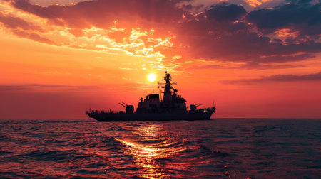 A powerful naval destroyer cuts through the ocean waves on a critical mission. Silhouetted against a fiery and dramatic sunset, the warship represents strength, vigilance, and the solitary duty of protecting the seas under a vast, cloud-filled sky.