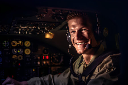 Portrait of a male pilot in the cockpit of a plane.