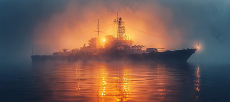 A large battleship is depicted sailing on calm, reflective water during sunset. The sky is a vibrant gradient of orange and yellow, casting a warm glow over the scene. The ship's silhouette is sharp against the colorful sky, and its reflection is visible on the glassy surface of the water. The tranquil atmosphere and the imposing presence of the warship create a dramatic and visual.