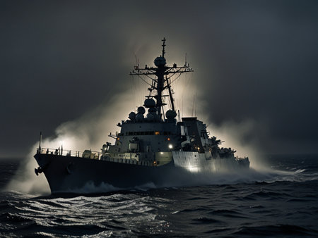 A powerful US Navy warship cuts through rough, dark ocean waters under a dramatic, stormy sky. Lightning strikes illuminate the scene, casting an intense glow on the vessel and the turbulent waves. The ship is depicted in motion, with water splashing around its hull, conveying a sense of power, speed, and the harsh realities of maritime operations in challenging weather conditions.