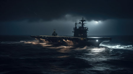 An AI generated illustration of a Navy Aircraft Carrier illuminated by the moonlight