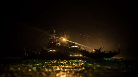 War concept. Night battle scene at sea. Dramatic toned clouds effect. Silhouette of the battle ship in night. Miniature creative table decoration. Selective focus