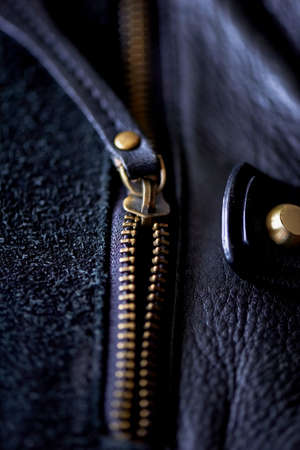 Close-up of zipper on leather texture. Horizontal background from a close-up of gray leather material