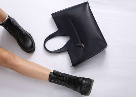 Flat lay composition of women's leather clothing, shoes and accessories. Jacket, boots, jeans, bag, purse and gloves on a white background. top view