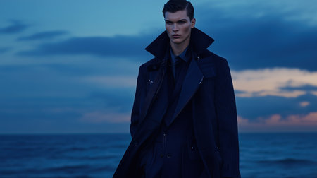 Navy Blue Ready-to-Wear Collection Highlighting Exquisite Tailoring and Graphic Color Blocks on a Finnish Model in Dynamic Outdoor Lighting
