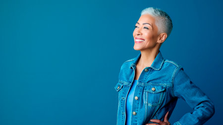 Portrait of a beautiful smiling woman in denim jacket on blue background