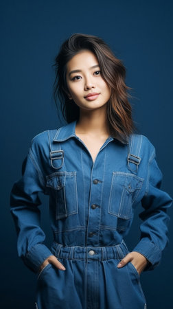 Generative AI : Portrait of Happy asian woman standing and feeling happiness and confident on blue background Cute asia girl smiling wearing casual travel uniform in jeans shirt an