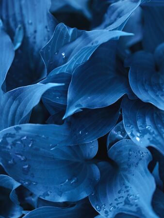 The color of the plant is classically blue. Juicy tones in trendy color. Copy space layout for design.The leaves of the host are tinted in a trendy classic blue. Top view, foliage card.