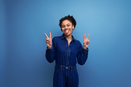 a young brunette latin woman with an afro hair tied up in a bun is dressed in a blue stylish denim suit