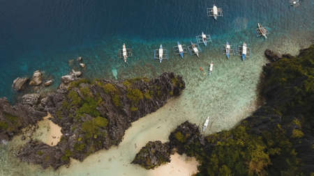 aerial view many boats in the turquoise lagoon, view from above. Seascape with blue bay and boats. traditional Filipino wooden outrigger boat called a banca. Summer and travel vacation concept