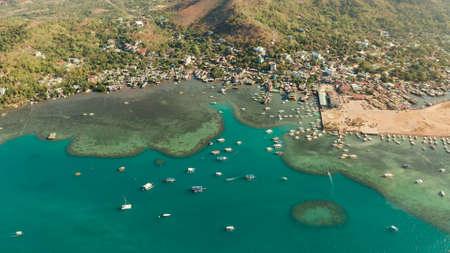 aerial view Coron City, tourist destination in the Philippines.Pier and promenade Coron town with boats on Busuanga island. Wooden boats waiting at pier. Seascape with mountains. Philippines, Palawan