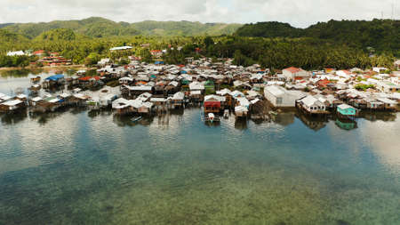 Old wooden house standing on the sea in the fishing village, aerial view. Dapa, Siargao, Philippines.