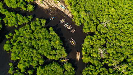 Tropical mangrove green tree forest view from above, trees, river. Mangrove landscape, Ecosystem and healthy environment concept. Mindanao, Philippines.