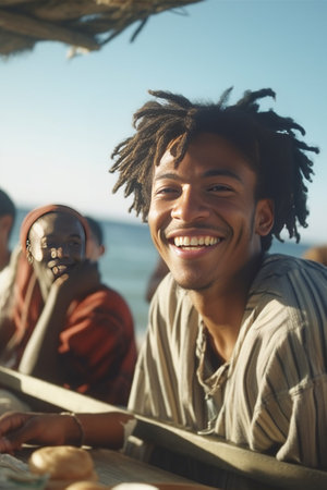 Summer vacations holidays and lifestyle Carefree happy young darkskinned male traveler having small picnic with friends by seaside eating juicy delicious watermelon again : Generative AI