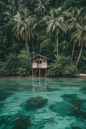 A serene wooden hut on stilts rests beside a tropical jungle, surrounded by palm trees and clear turquoise water. Ideal for themes of escape, isolation, tropical retreats, and natural beauty.