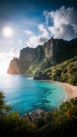 Experience a breathtaking coastal view featuring dramatic cliffs and lush greenery bathed in soft sunlight. This tranquil scene invites relaxation and exploration.