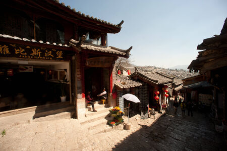 Yunnan, China - 22 March 2016: Lijiang ancient town old streets and shophouses on sunny morning.