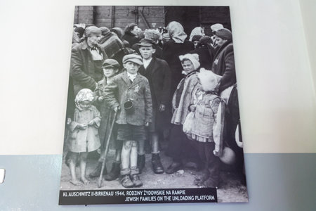 OSWIECIM, POLAND - SEPTEMBER 7, 2022: Photo gallery of prisoners in Auschwitz concentration camp in a sunny day, Oswiecim, Poland