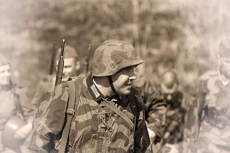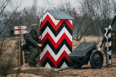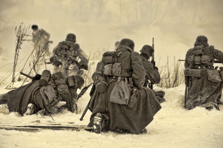Gomel, Belarus - November 26, 2016: Soviet soldiers of the Red Army launched an attack on the checkpoint of the German army of the Wehrmacht