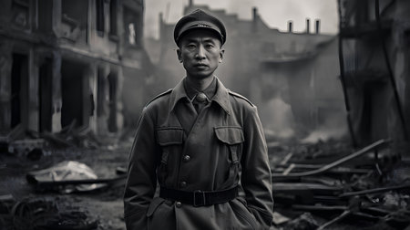 War Concept. Military man in WW2 military uniform standing on ruins of destroyed building background.