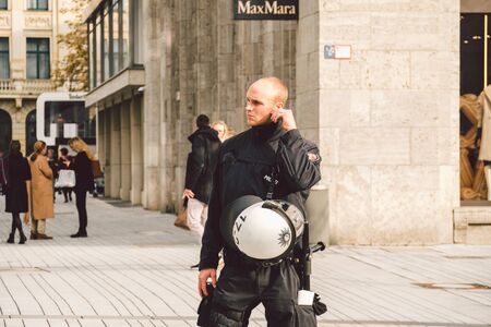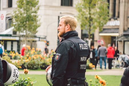 German police officer. Riot Police Germany. Police patrolling in dusseldorf October 27, 2018. German policemen Polizei at work. The subject of law enforcement, public protection, utilities in Europe.