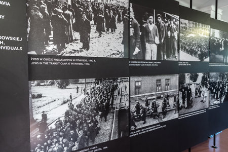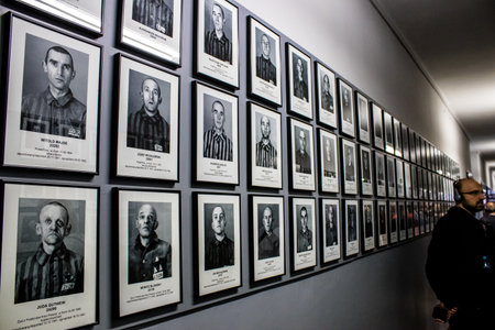 OSWIECIM, POLAND - SEPTEMBER 7, 2022: Photo gallery of prisoners in Auschwitz concentration camp in a sunny day, Oswiecim, Poland