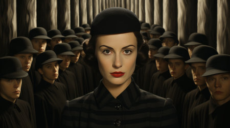 A fashion-forward woman exudes confidence in her bold black hat and striped shirt as she stands indoors, her headgear serving as a striking accessory to her unique style