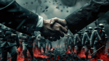 Businessmen handshake illustration. Blood, war and soldiers on the background. Bloody politics concept. AI Generated