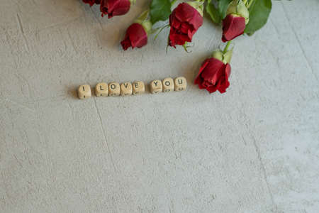 the words I love you from letters on a blurred concrete background with roses out of focus, the concept of Valentines Day and March 8
