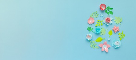 Easter egg made of paper flowers on blue background. Cut from paper.