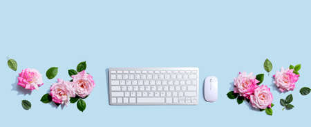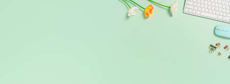 Creative flat lay photo of workspace desk. Top view office desk with keyboard and mouse on pastel green color background. Panoramic banner with copy space for text and Advertising area.