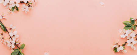 April floral nature. Spring blossom and may flowers on pink. For banner, branches of blossoming cherry against background. Dreamy romantic image, landscape panorama, copy space