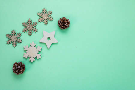 Top view with copy space for december season. Christmas composition with glittery ornaments and decorations.